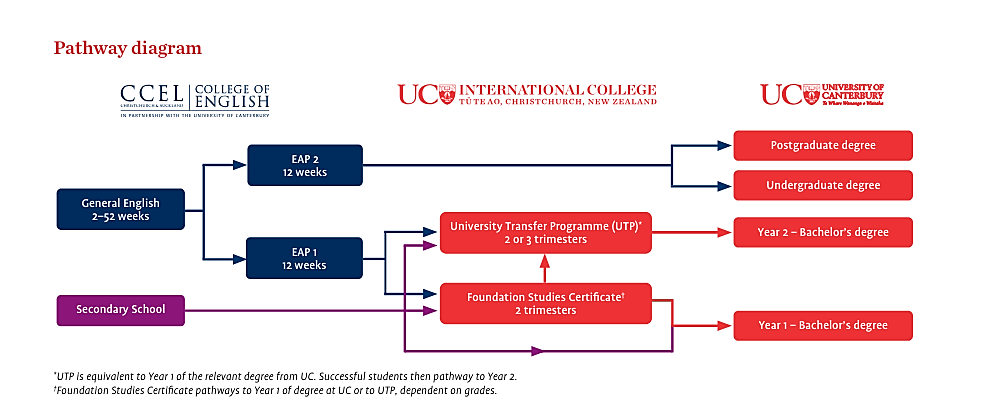 Đây là nơi giúp các bạn liên thông trực tiếp lên trường Đại học Canterbury. UCIC cung cấp các chương trình Chuyển tiếp thông qua khóa học Dự bị (Foundation Studies) hay khóa học Cao đẳng (UTP) duy nhất ở New Zealand . Chương trình chuyển tiếp này sẽ tương đương với năm đầu tiên của bằng cử nhân của Đại học Canterbury. Sau khi hoàn thành chương trình UTP, sinh viên sẽ chuyển sang năm thứ hai trường Đại học Canterbury.